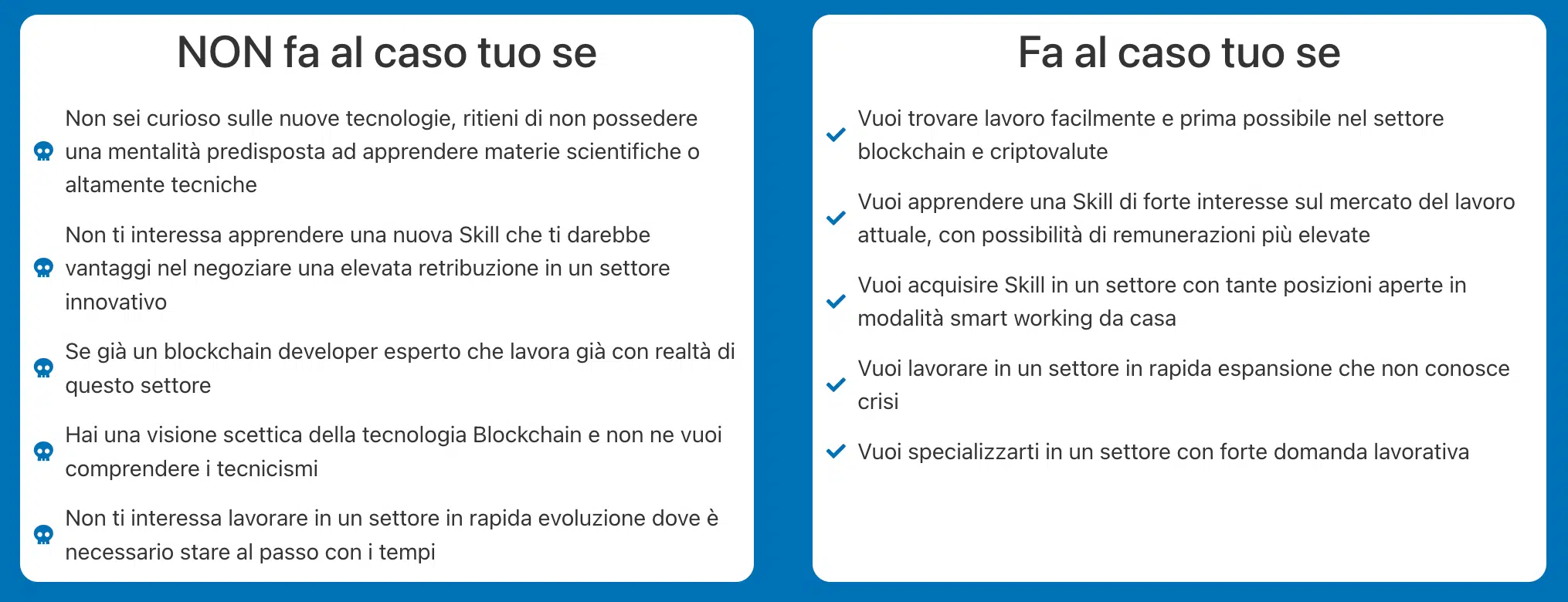 - Master Full; a nostro avviso è il modulo da scegliere se realmente interessati, in quanto presenta anche la parte dedicata a react e al web3, oltre che la possibilità di stage.