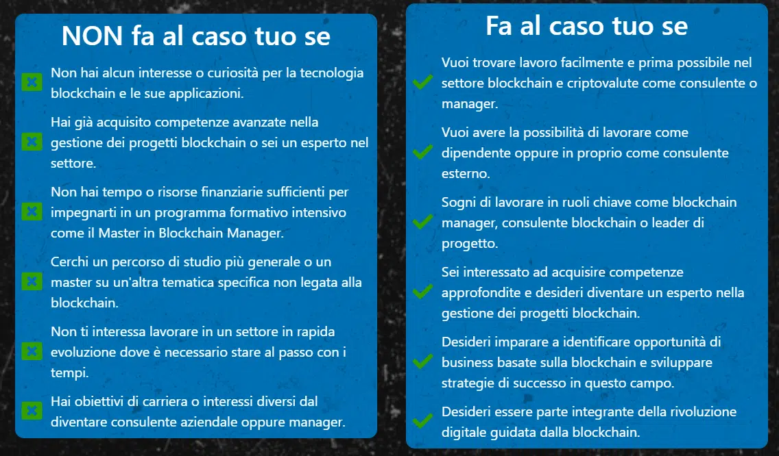 Il Master “Blockchain Manager” è rivolto a tutti coloro che desiderano apprendere una Skill altamente rivendibile nel mercato e trovare lavoro velocemente nel settore Blockchain come Manager o Consulente Blockchain.