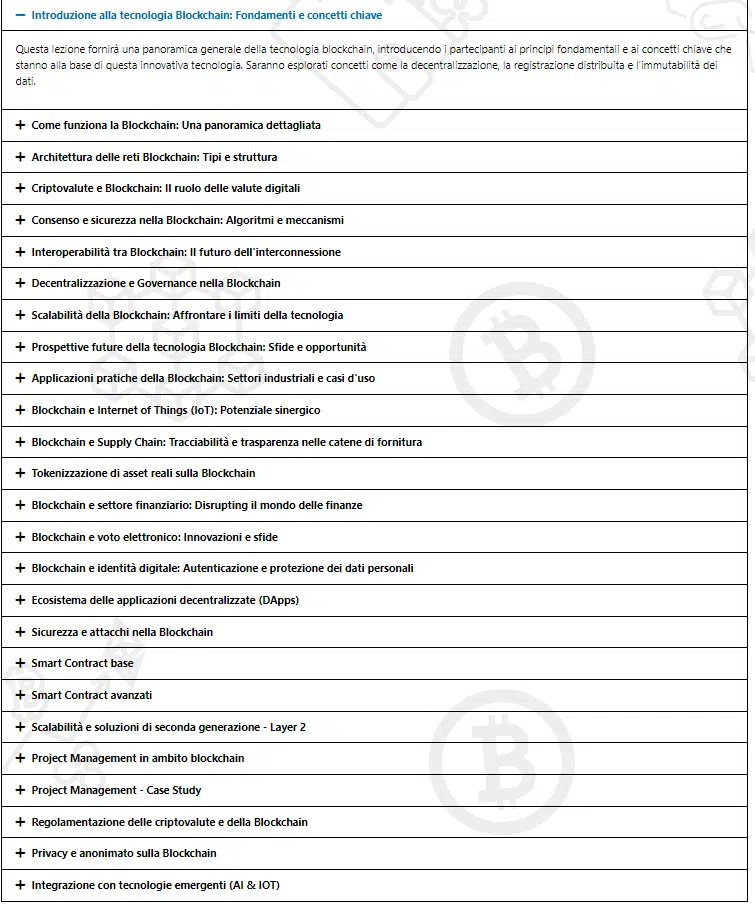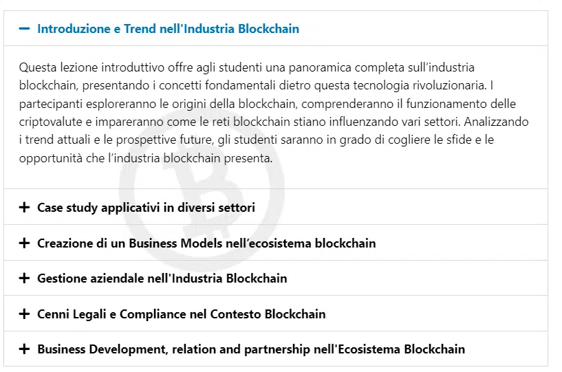 - Master Manager; con focus su tutto ciò che ti serve apprendere per diventare un Manager/consulente Blockchain. (45 ore)