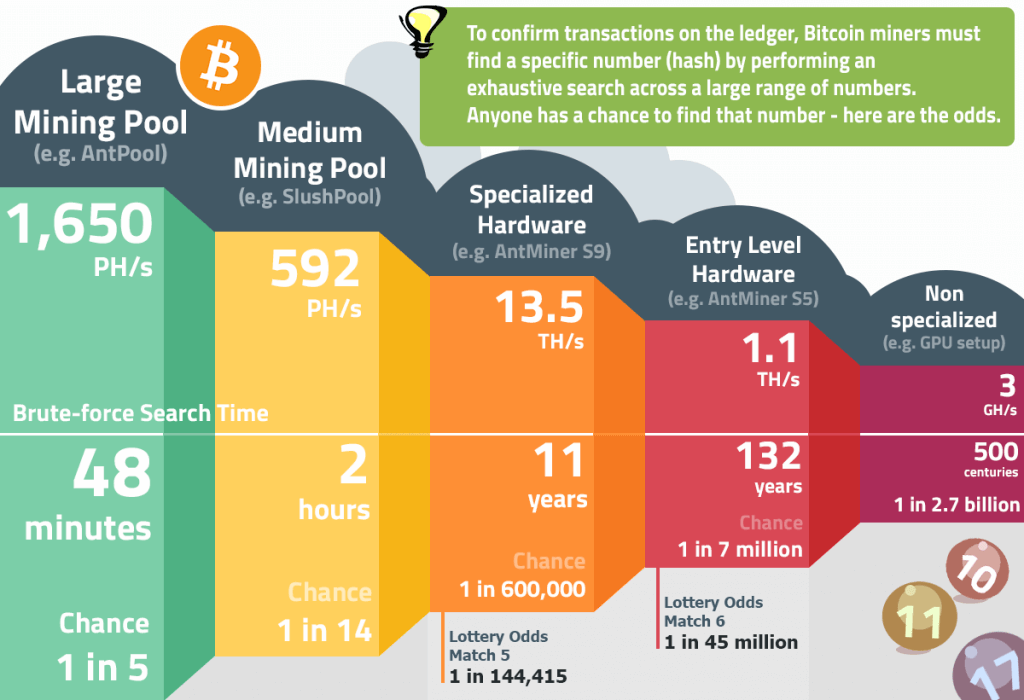 Teoricamente se mini bitcoin in solitaria con una scheda video da 1 gh/s puoi chiudere il blocco e prendere 12.5 btc, esiste una minima probabilità. In realtà comunque, chiudere il blocco in solitaria nei prossimi 10 minuti è pressochè impossibile, la probabilità di farlo è 1 su