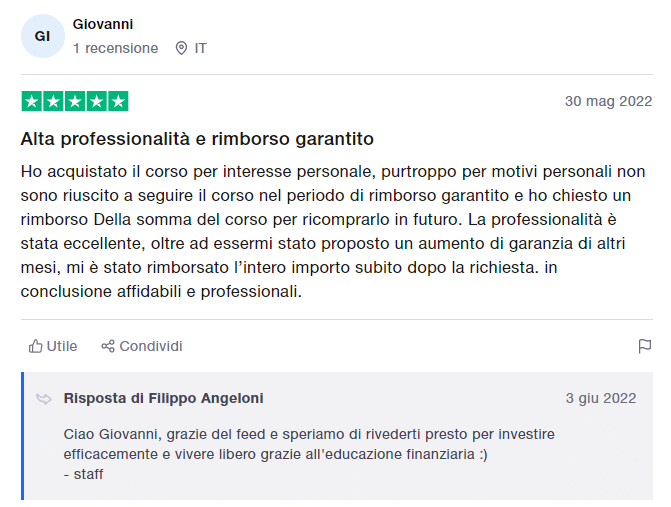Meno dell’1% dei nostri corsisti ha chiesto un rimborso fino ad oggi. Il 100% di chi ha richiesto il rimborso è stato rimborsato (con tempi tecnici del bonifico bancario).