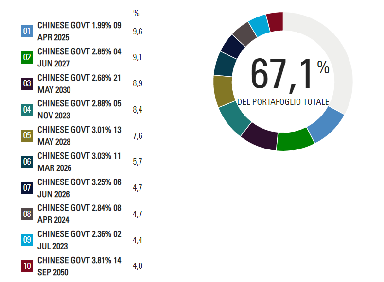 - rischio basso grazie ai titoli investment grade che compongono il portafoglio. La Cina è uno dei paesi più solidi al mondo infatti presenta un rating medio di A+ (l’Italia è BBB);