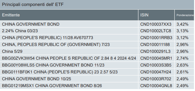Il fondo replica la performance di titoli obbligazionari governativi denominati in renminbi cinesi emessi dal Tesoro cinese e da enti governativi regionali della Cina con rating investment grade.