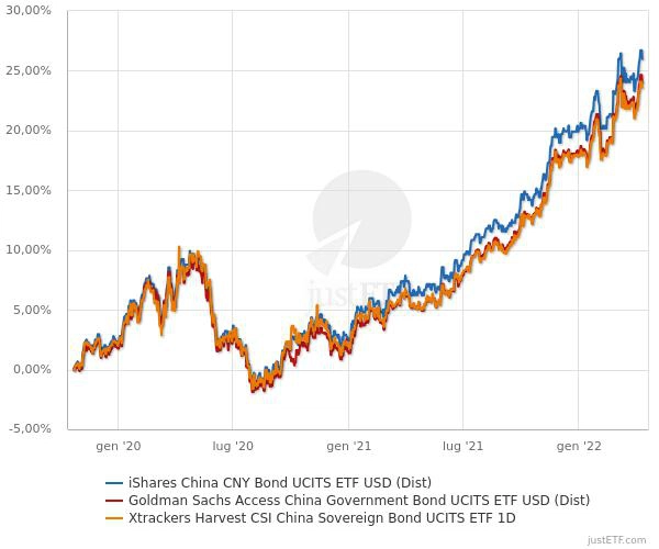 I 3 migliori ETF obbligazionari cinesi hanno avuto delle performance medie attorno al 25% da ottobre 2019 con delle differenze minime.
