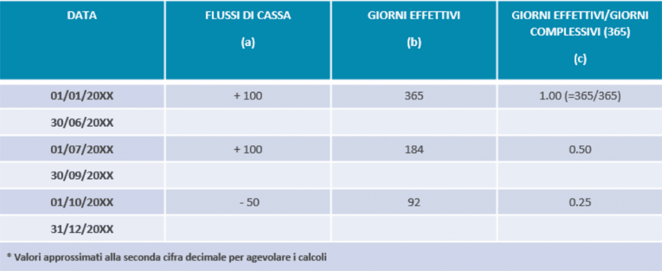 Ogni flusso di cassa viene ponderato per il numero di giorni relativi alla permanenza all’interno della gestione patrimoniale (per gli investimenti) o il numero di giorni relativi alla fuoriuscita (per i riscatti).