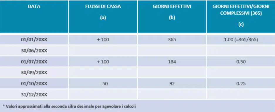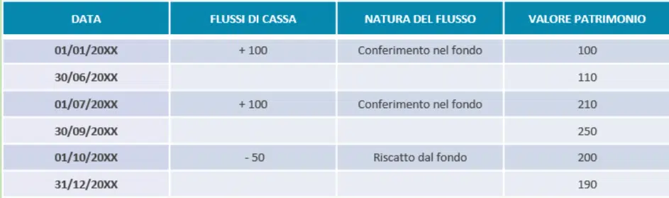 Ogni flusso di cassa viene ponderato per il numero di giorni relativi alla permanenza all’interno della gestione patrimoniale (per gli investimenti) o il numero di giorni relativi alla fuoriuscita (per i riscatti).