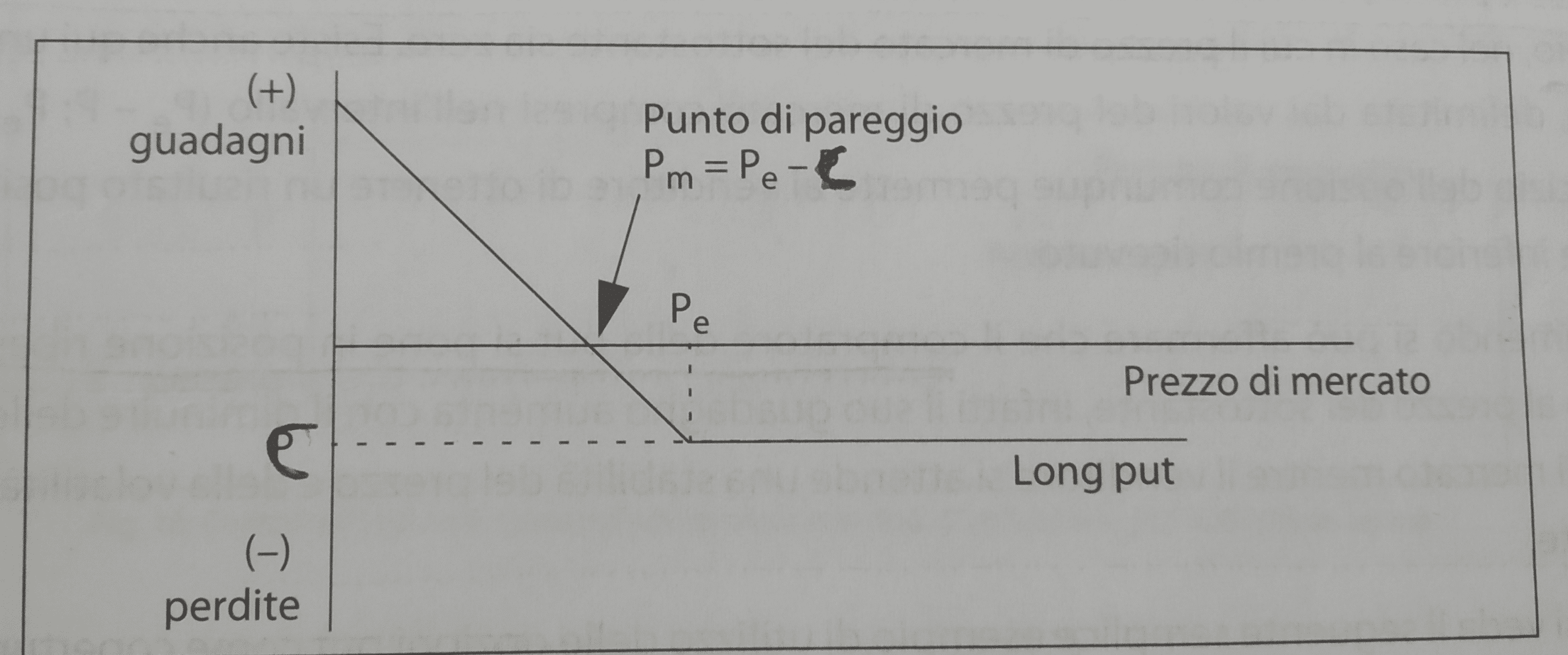 Dal grafico è possibile desumere che l’acquisto di un’opzione put comporta un rischio di perdita massima limitato, pari al premio, mentre il guadagno massimo è pari al prezzo di esercizio diminuito del premio, ipotizzando che il prezzo di mercato sia zero.