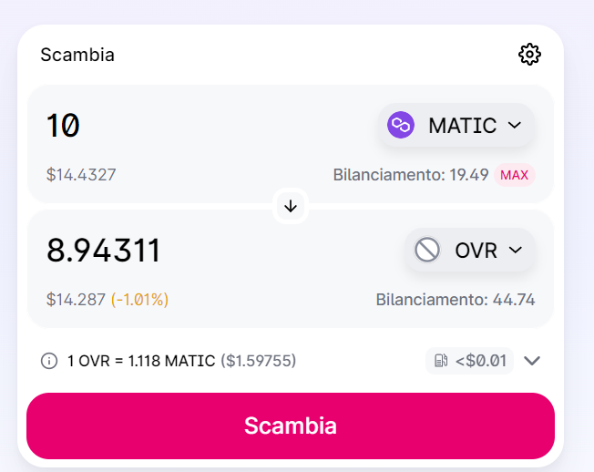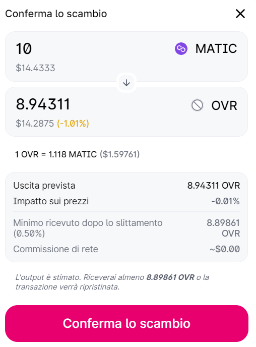 - comprare OVR su Polygon con solo 0,01$ di fees;