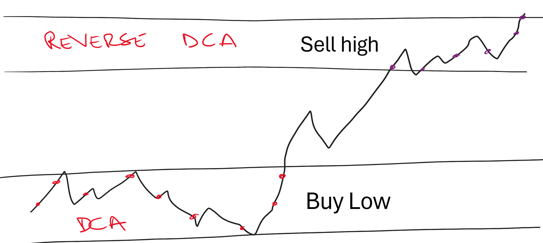 Esempio: Prima effettuo un PAC tradizionale, quando vi è panico/depressione sul mercato del Bitcoin, quindi accumulo ad un prezzo “a terra”, e poi decumulo (pac inverso) in fase di euforia.