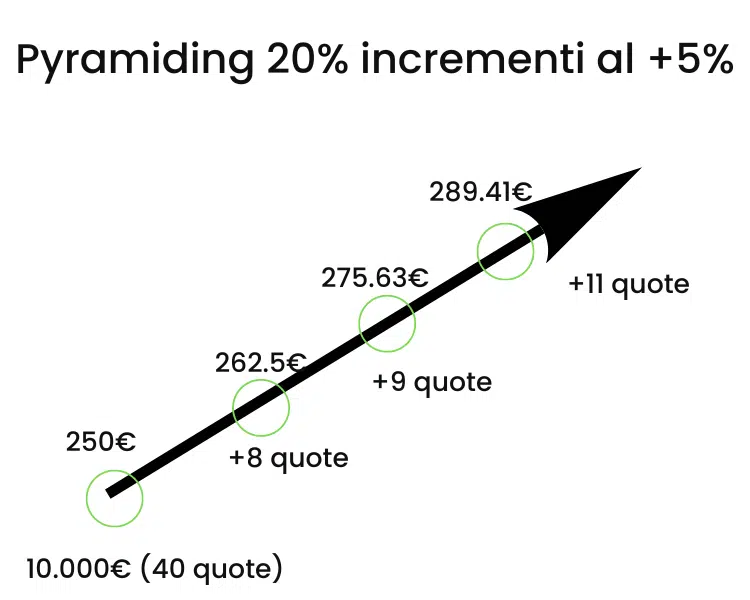 Strategia di Pyramiding: Il trader stabilisce di incrementare la sua posizione del 20% ogni volta che l’ETF aumenta del 5% nel valore.