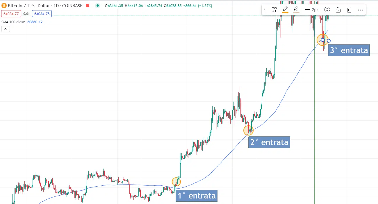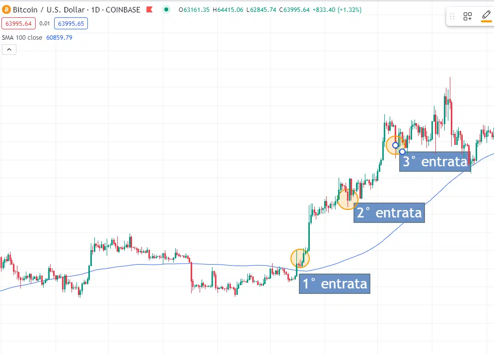 Oppure ancora si potrebbero aggiungere posizioni man mano che il prezzo sale ma solo quando il prezzo dello strumenti finanziario si riporti a toccare la media mobile a 100 periodi.