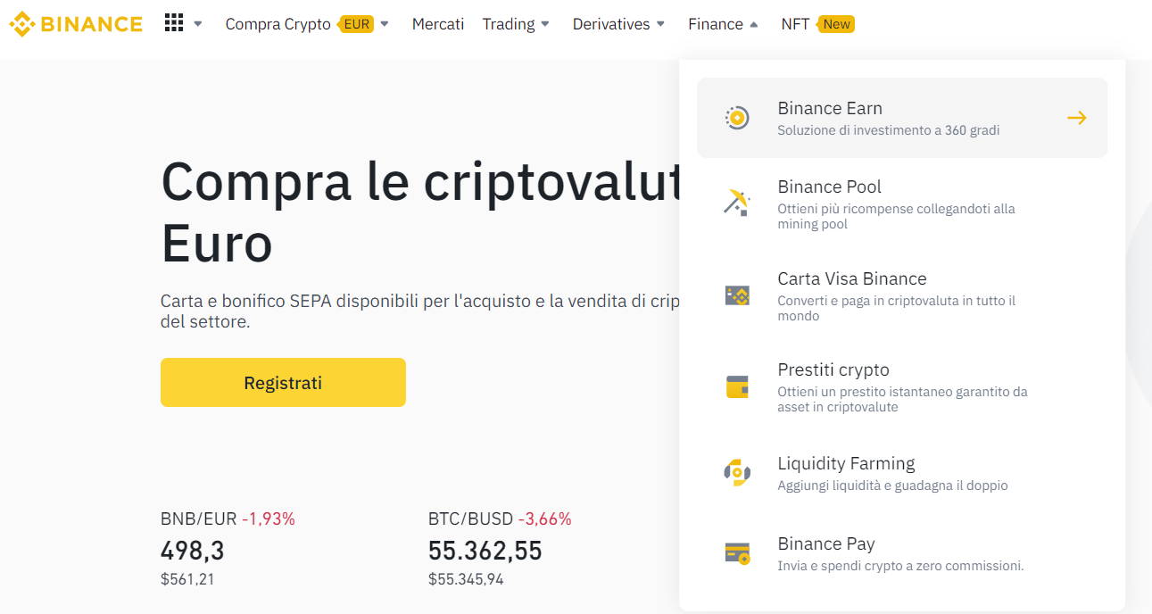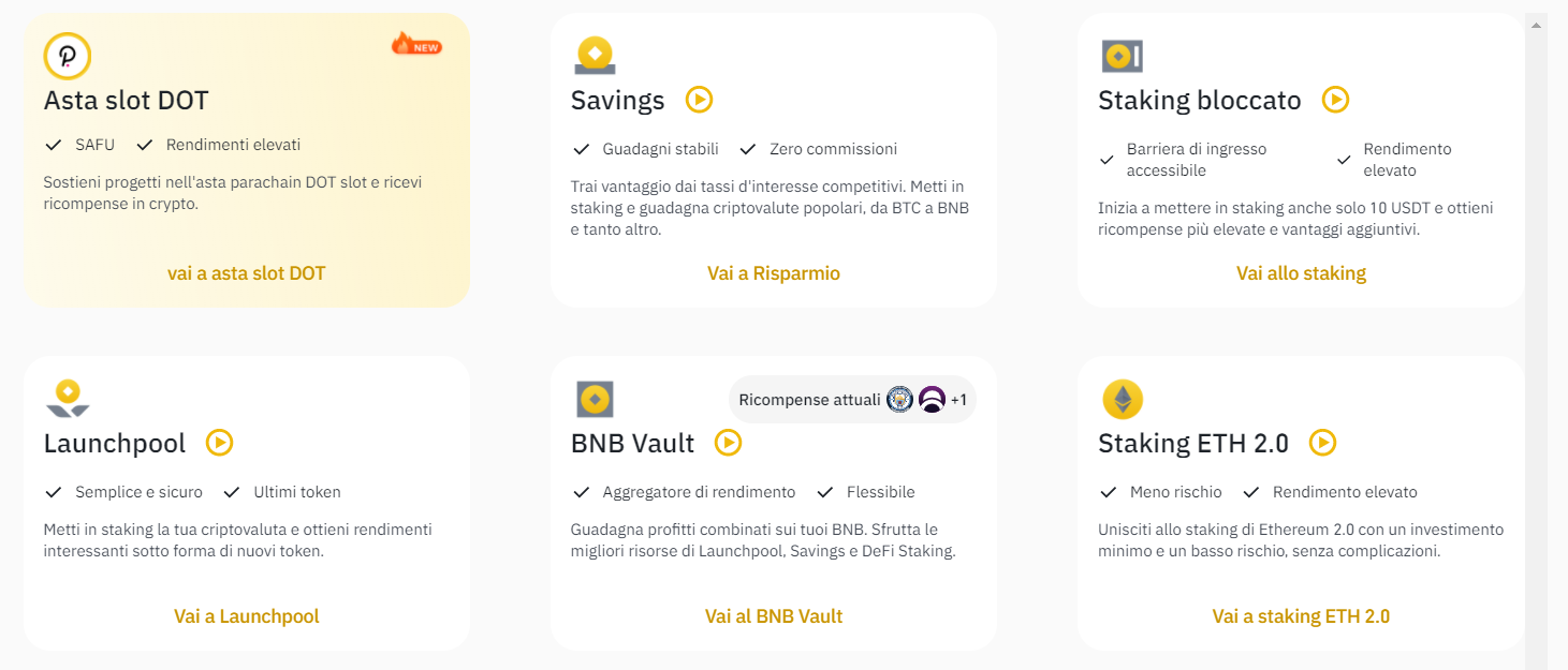 • ti si aprirà un elenco dal quale devi premere la voce “Binance Earn”;