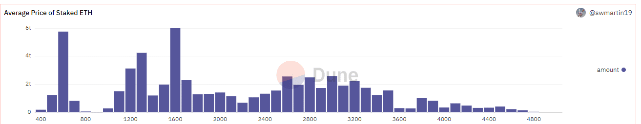 Interessante però è analizzare questo grafico a barre che mostra la quantità di ETH messi in staking in base al loro prezzo.