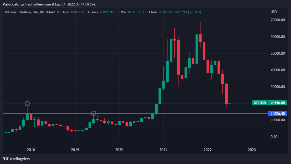 Il grafico di Bitcoin con candele mensili ci da una panoramica ampia e generale di come si è mosso il mercato e ci permette di individuare ottimi livelli di prezzo.