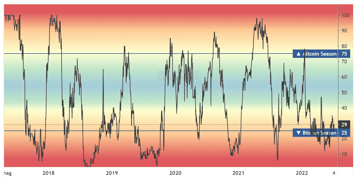 L’altcoin season index dice che se il 75% delle prime 50 criptovalute ha ottenuto risultati migliori rispetto a Bitcoin nell’ultima stagione (90 giorni) vuol dire che siamo in altcoin season.