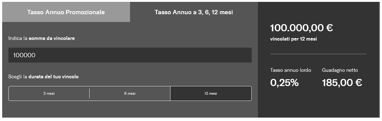 Per esempio su un deposito di 100.000 per 12 mesi, il rendimento lordo è pari al 0,25% che, meno il 26%, genera un rendimento netto del 0,185%.