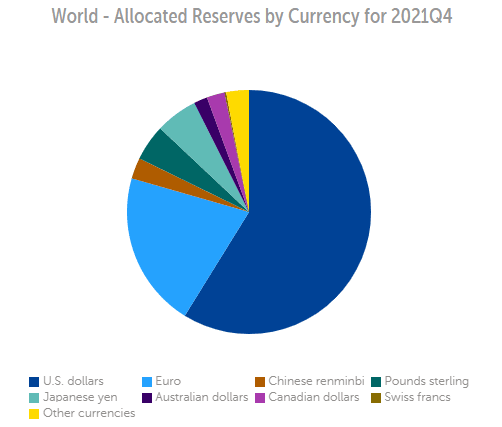 Quasi il 70% delle riserve valutarie è composto da dollari ed euro e le uniche altre valute forti in ambito internazionale sono la sterlina e il renminbi.