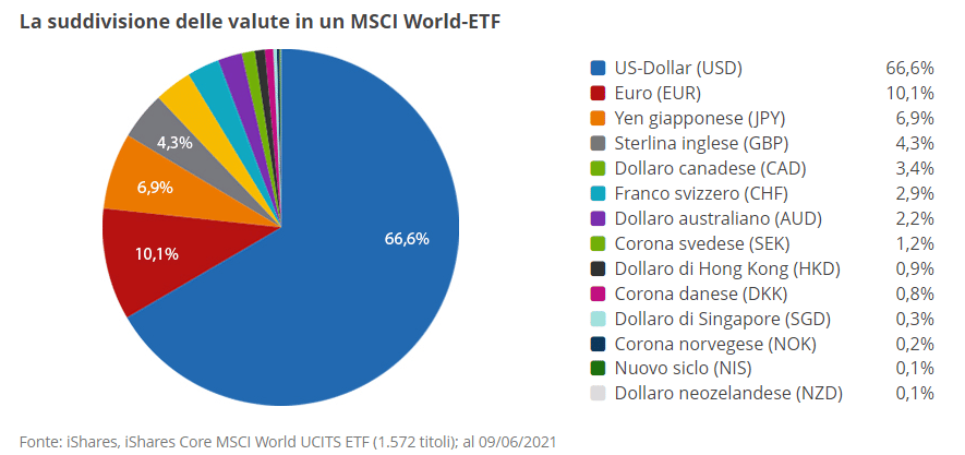 Come puoi notare da questo grafico l’indice MSCI World, che replica le società dei 23 paesi sviluppati del mondo, ha già in sè una diversificazione per valuta che però non è completa o almeno non è abbastanza.