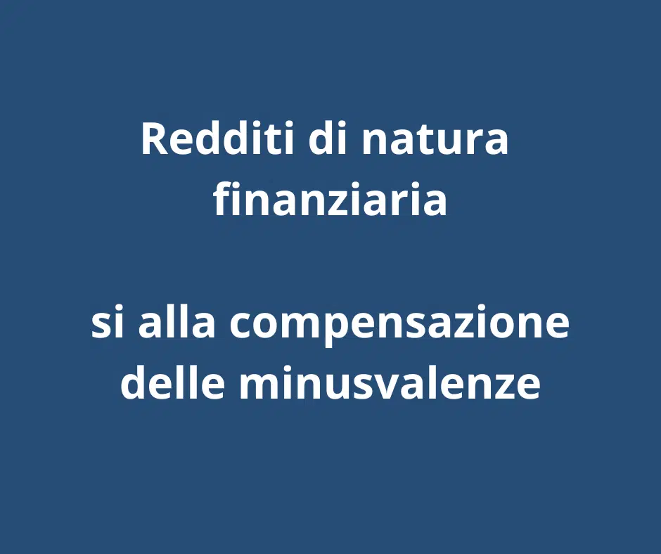 realizzati nell’anno solare, ottenuto sommando algebricamente i redditi finanziari positivi con i redditi finanziari negativi, con possibilità di riportare le eccedenze negative nei periodi d’imposta successivi a quello di formazione;