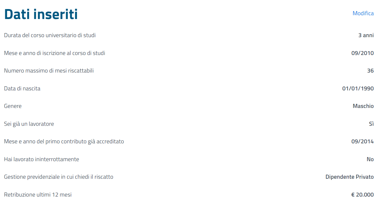 In questo esempio ho configurato un ragazzo che ha iniziato il percorso di laurea appena finito le scuole superiori e che ha intrapreso una laurea triennale. Durante il percorso universitario non hai mai lavorato ed è entrato nel mondo del lavoro successivamente alla laurea.
