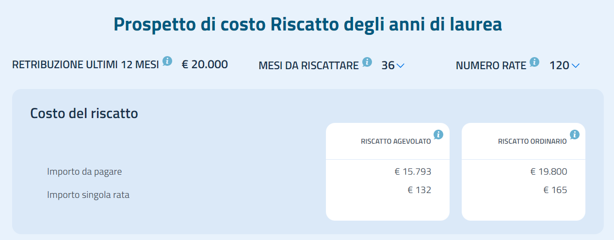 Il riscatto agevolato gli comporta un costo di 15.793€ che diviso i 3 anni di studi comporta un costo annuo di appunto 5264€ (costo del regime agevolato nel 2021). Il costo è rateizzabile in 120 mesi con un importo mensile di 132€.
