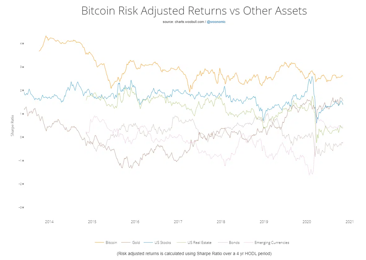 In questo grafico i rendimenti aggiustati per il rischio del bitcoin vengono comparati con azionario USA, immobiliare USA, obbligazioni USA e Gold.