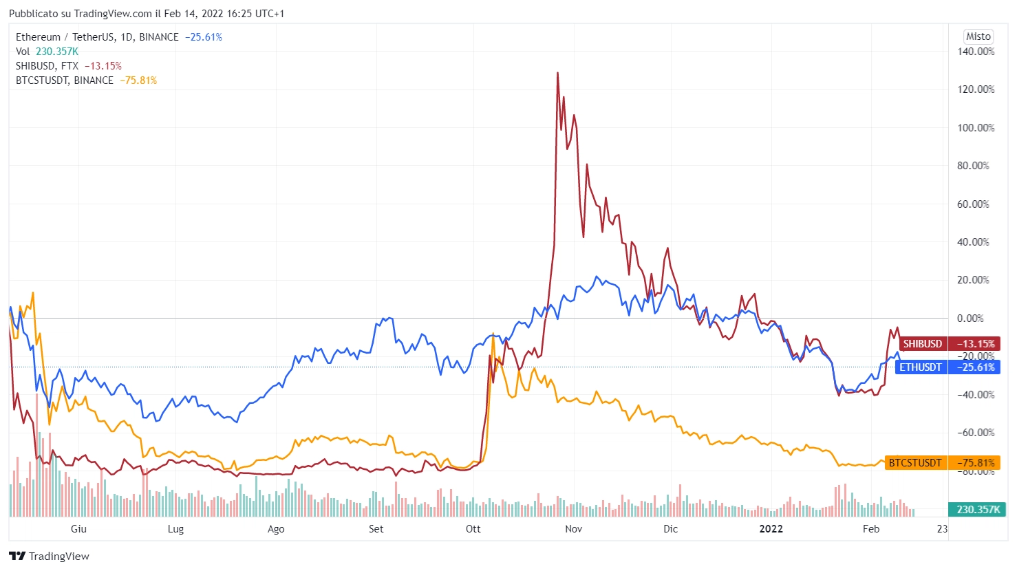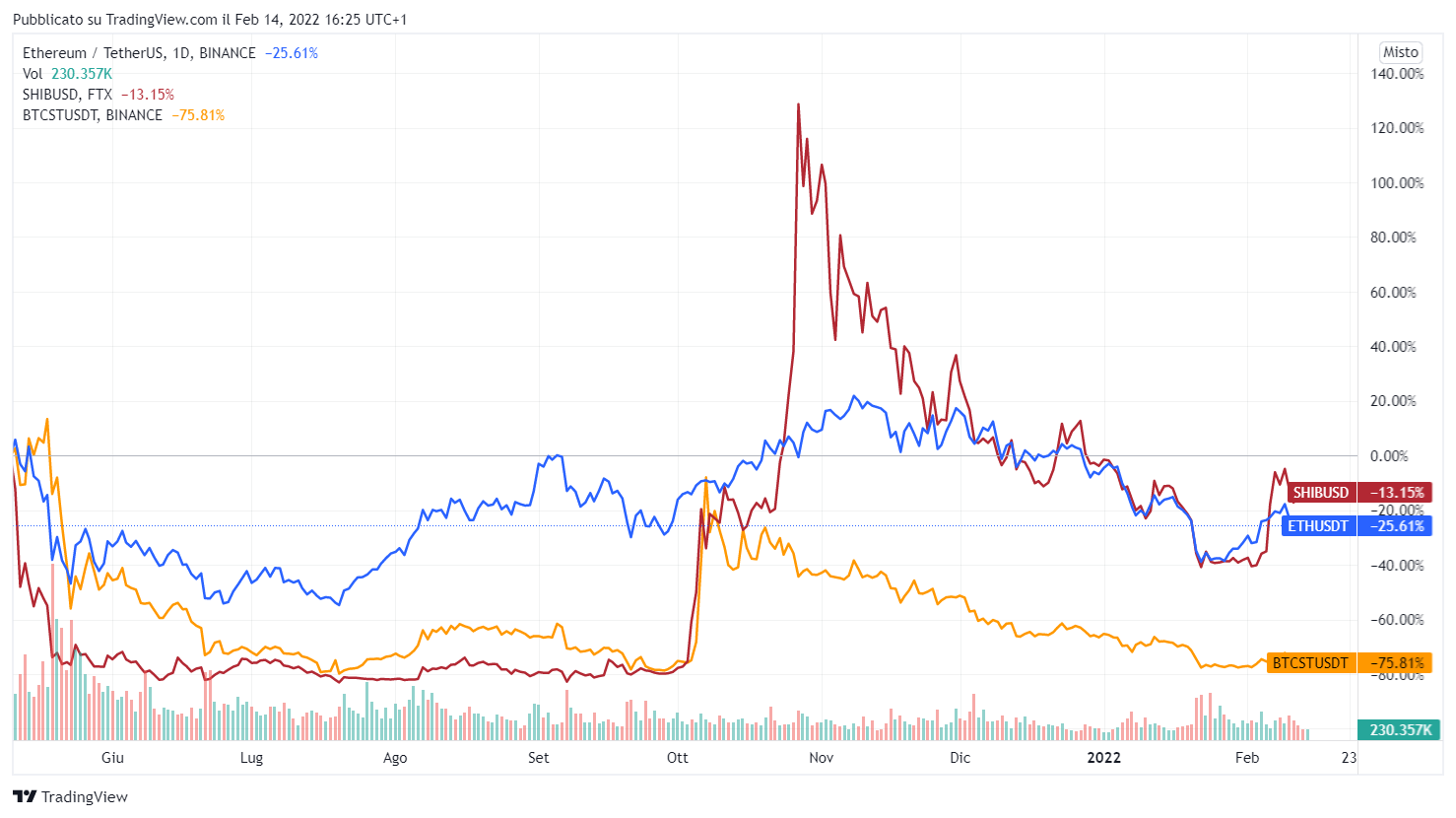 Se il suo prezzo viene confrontato a Bitcoin ed Ethereum da maggio 2021 ha sovraperformato BTC ed ETH. Da novembre, ha perso il 13,64% rispetto a Bitcoin, mentre negll’ultimo mese il loro andamento è stato simile.