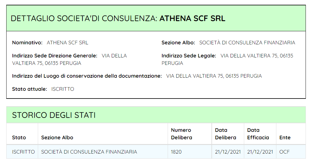 Questa schermata mostra l’iscrizione di Athena SCF S.r.l. di Filippo Angeloni con delibera n.1820 del 21/12/2021 con sede a Perugia in Umbria.