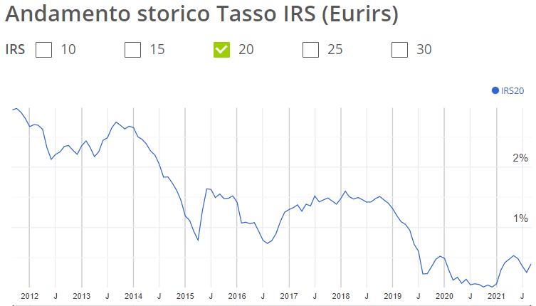 I tassi di interesse sui mutui è da parecchio tempo che sono molto bassi. Il grafico mostra l’IRS, il tasso di interesse dei mutui a tasso fisso.