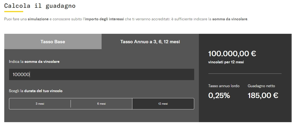 Utilizziamo il calcolatore di chebanca, ma potremmo prendere praticamente qualsiasi calcolatore offerto dalle varie banche che offrono conti vincolati e di deposito.