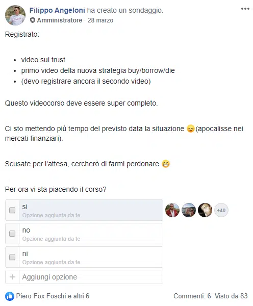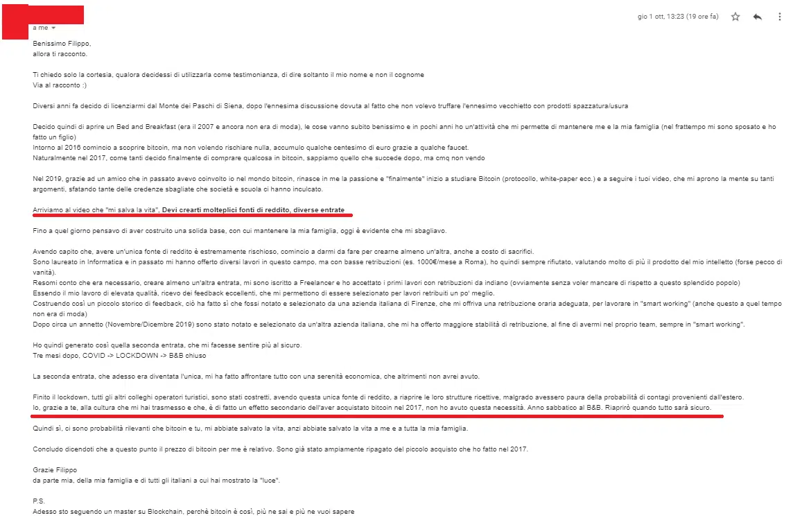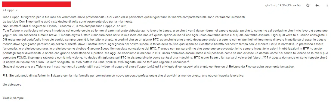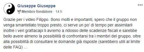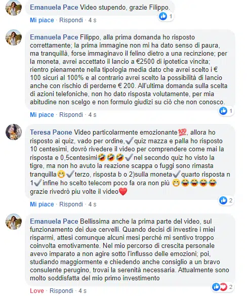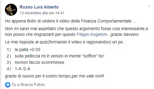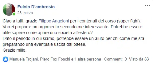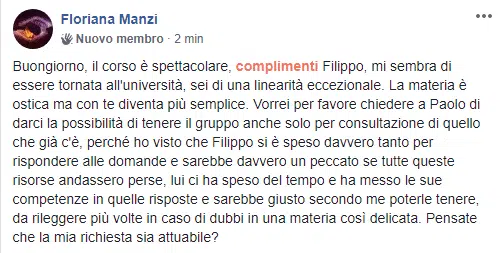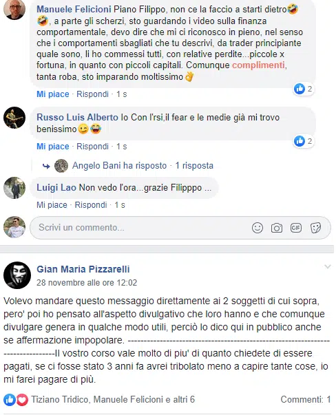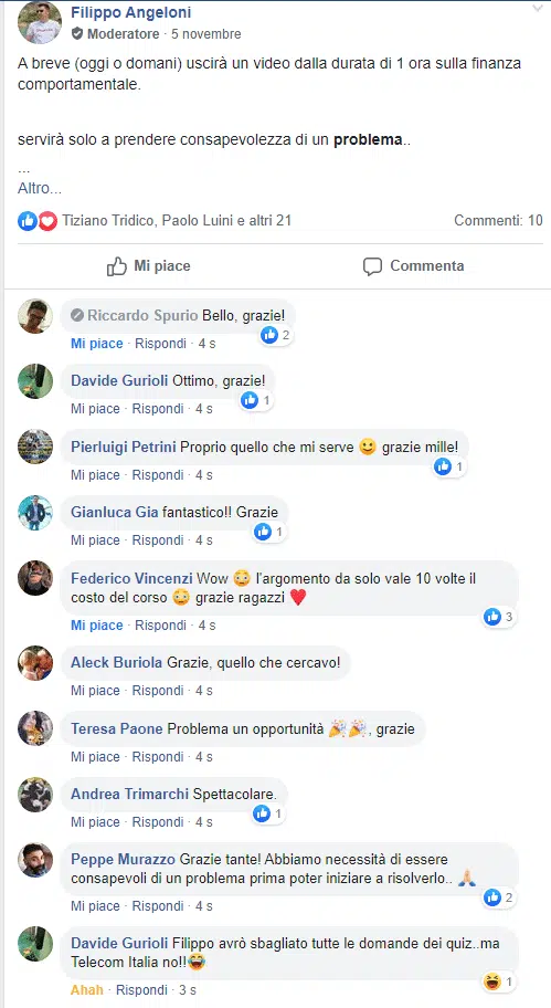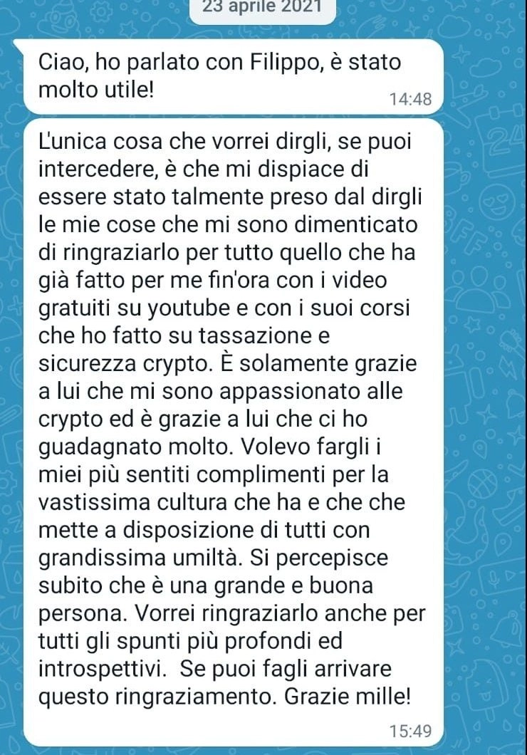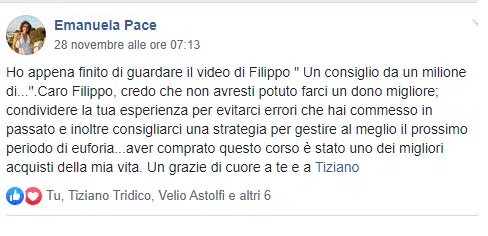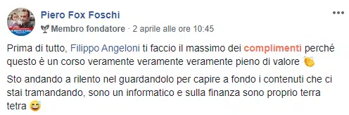 “Sai che se esce un tuo nuovo prodotto/servizio io ci sono sempre, neanche guardo più al prezzo oramai…Filippo che dire non ho parole mi hai cambiato la vita, contami pure tra i tuoi corsisti a vita”