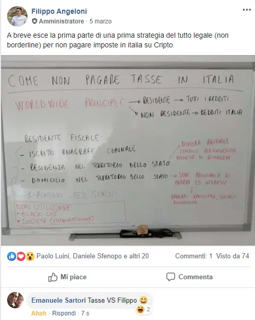 "30 dicembre 2020 sto tornando con mia moglie da Luino provincia di Varese dopo aver adottato l'ultimo doberman. All'altezza di Bologna mi squilla il cellulare, dallo schermo vedo che è un numero che non conosco, solitamente non rispondo ai numeri che non ho in rubrica. Quella volta dato che ero in automobile e non avevo impegni, risposi. Dall'altra parte c'è un ragazzo giovane che si presenta "mi chiamo Filippo Angeloni", fu una conversazione piacevole. Il Dott. Filippo Angeloni mi vide in una live di un canale Youtube importante e fu li che mi ricontattò. A distanza di qualche giorno ci risentimmo e mi propose di fare una diretta insieme. La diretta si tenne il 6 gennaio del 2021. Ancora ad oggi è la diretta con maggiori utenti live e visualizzazioni a tema di oro fisico da investimento. Al di là dell'aspetto professionale, persona professionale, corretta e competente è nato anche un ottimo rapporto umano, quindi sono di parte nel dire che Filippo Angeloni e tutti i ragazzi che collaborano con lui, Giacomo in primis, sono ragazzi con i quali mi trovo perfettamente a mio agio e considero tutti miei figli"