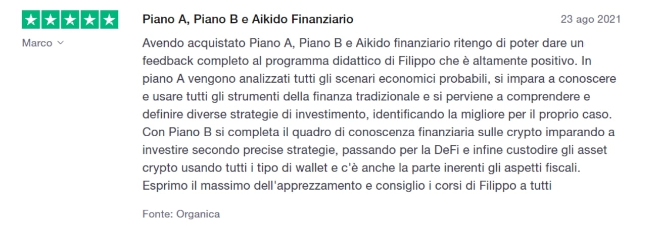 Ho conosciuto Filippo Angeloni su YouTube nel 2018 in coppia con Tiziano Tridico e nel 2021 ho deciso di investire nei suoi percorsi formativi, inizialmente con Piano A e Aikido Finanziario. In Piano A cercavo un corso per chi vuole entrare nel mondo degli investimenti senza farsi truffare dalle banche e dai loro consulenti, e già solo per questo sono totalmente soddisfatto dell’acquisto. Ma le conoscenze trasmesse vanno ben oltre la teoria…Piano A ti mette a disposizione non solo le conoscenze di Filippo, ma ti insegna anche a come sviluppare il giusto mindset per affrontare e gestire i tuoi investimenti nel corso del tempo. Grazie per il lavoro che fate si vede che ci tenete davvero…Non vi rendete conto di quanto valore state dando alla società in questo periodo così incerto e difficile. Complimenti a Filippo e a tutto il team. E grazie Giacomo per la tua disponibilità e cordialità.