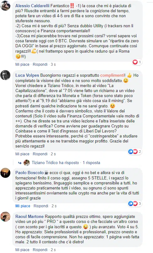 Il corso Piano A é davvero un corso coi fiocchi! Grazie davvero di cuore. Per chi gli piacerebbe investire e non sa bene da dove partire Filippo lo spiega egregiamente. Se lo avessi fatto prima ed avessi seguito i suoi consigli alla lettera mi sarei risparmiato un bel pó di errori, anche costosi. Lo consiglio vivamente perchè non è solo un inizio nel mondo degli investimenti ma ti aiuta a capire e poi come attuare fino in fondo. Ed il team è sempre presente! 100% soddisfatto.