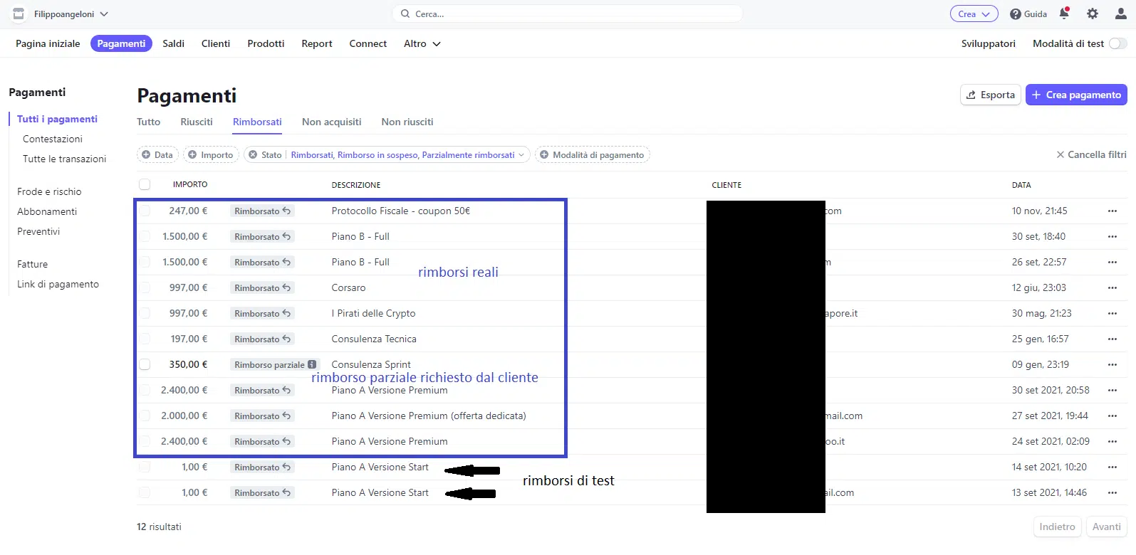 N.B. come politica aziendale lasciamo dei fondi per eventuali rimborsi sia in Paypal che in Stripe, in questo modo se il pagamento è passato da li riusciamo a rimborsare anche entro 1 ora al massimo dalla richiesta di rimborso.