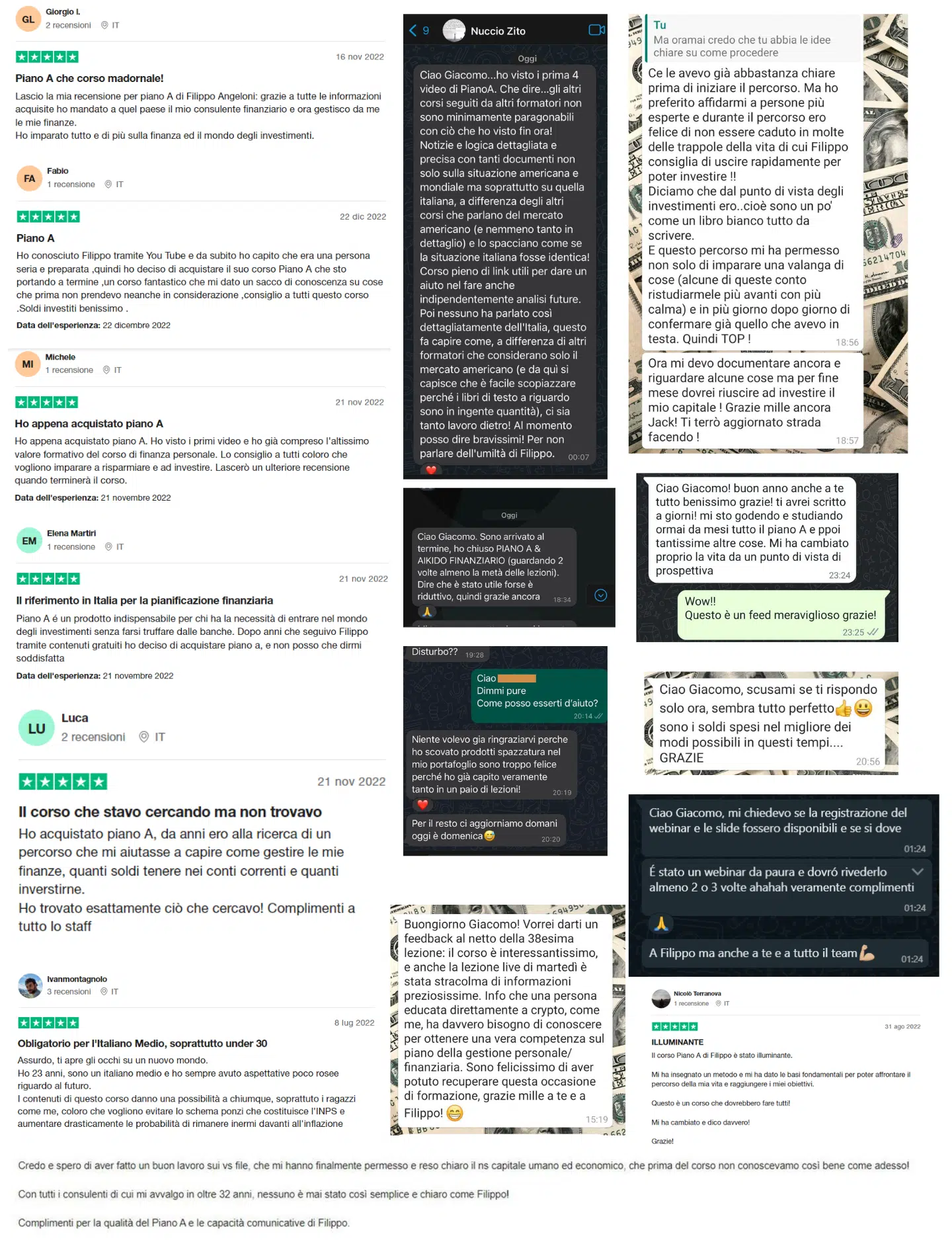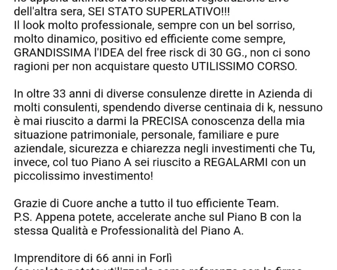 Piano A e’ stato un percorso che mi ha cambiato la vita. Dopo mesi di studio e di appunti forsennati posso dire di aver trovato un percorso validissimo, completo, molto ben esplicato, pieno di esempi, con centinaia di video le cui slides sono trascritte e unite a file in pdf e persino mp3… piano A premium ha cambiato la mia visione del danaro e della gestione dello stesso, del risparmio, del ruolo delle banche e dei fondi in genere. Per non parlare delle preziosissime due ore passate in studio da Filippo a Perugia per consulenza one to one..Sono stato così soddisfatto che l’anno successivo ho comprato anche Piano B. Consiglio fortemente!!