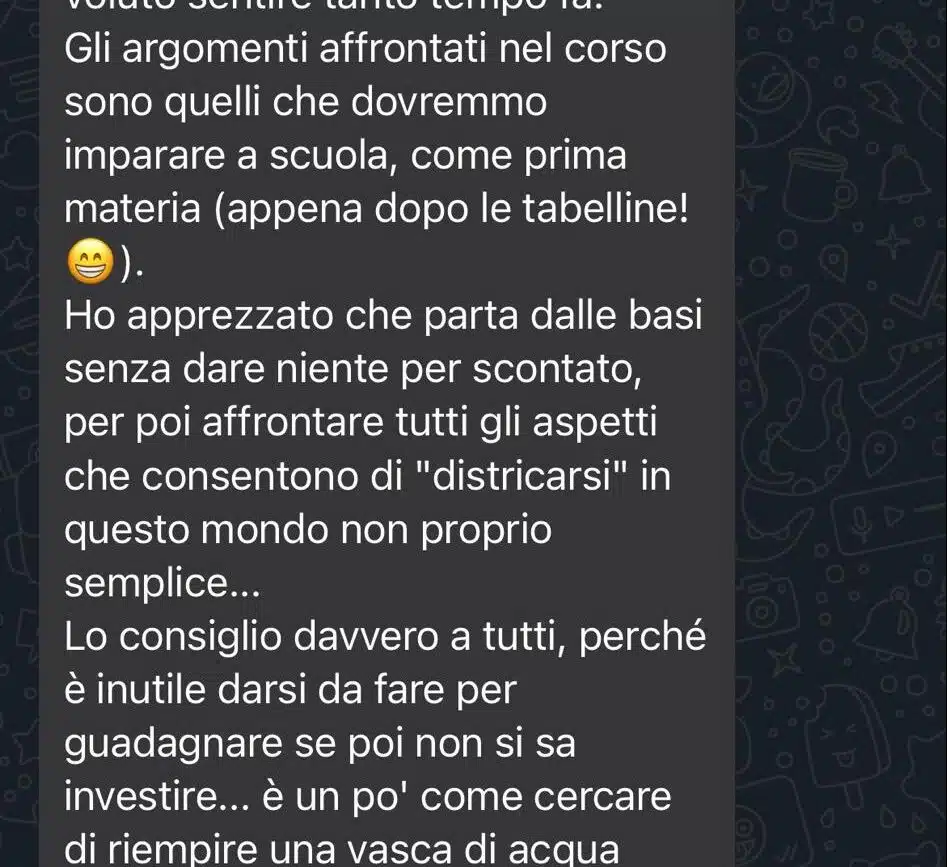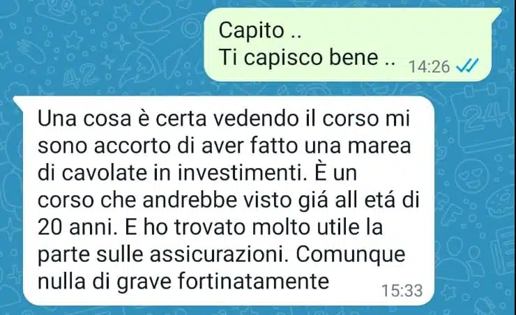 Unico rimpianto: non averlo fatto prima. Mentre ascoltavo le parole di Filippo durante il corso, le percepivo come le parole che avrei voluto sentire tanto tempo fa. Gli argomenti affrontati nel corso sono quelli che dovremmo imparare a scuola, come prima materia (appena dopo le tabelline! 😁). Ho apprezzato che parta dalle basi senza dare niente per scontato, per poi affrontare tutti gli aspetti che consentono di "districarsi" in questo mondo non proprio semplice... Lo consiglio davvero a tutti, perché è inutile darsi da fare per guadagnare se poi non si sa investire... è un po' come cercare di riempire una vasca di acqua senza tapparne il buco... Buon corso a tutti!