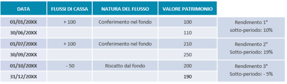 Esempio: possiamo suddividere il periodo di investimento, come mostrato in tabella seguente, in tre sottoperiodi, poiché si sono verificati 3 flussi di cassa: due in entrata (+100 euro e +100 euro) e uno in uscita (-50 euro).