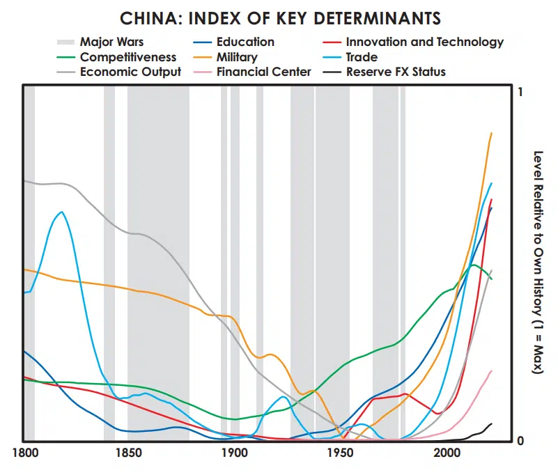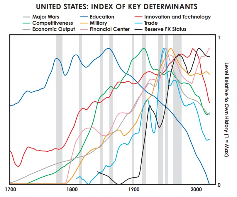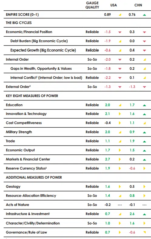 Ray Dalio ha calcolato la potenze degli imperi prendendo in considerazione 18 variabili, 8 più importanti e 10 meno importanti.