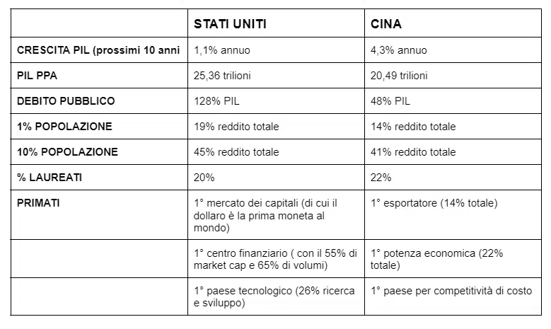 Questa tabella compara USA e Cina su tutti i punti di interesse che possono essere considerati nelle proprie strategie di investimento.