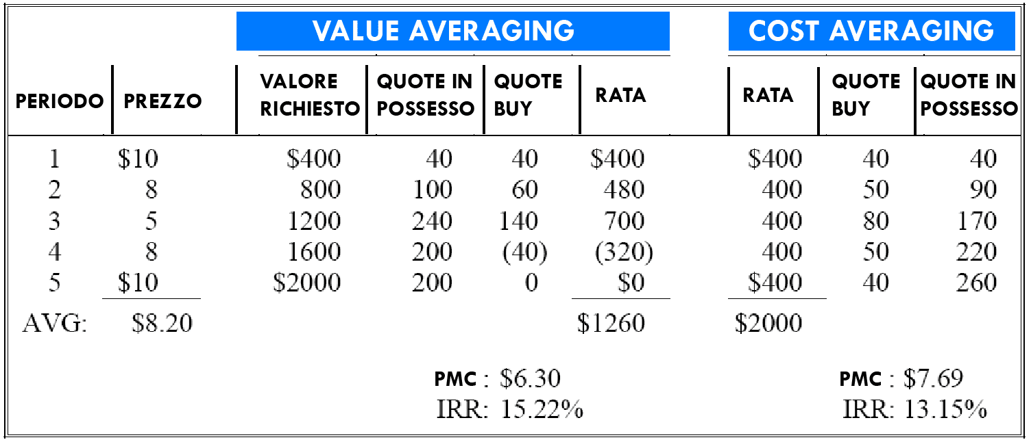 Nel caso invece di value averaging quello che conta non è la rata costante di 400$ ma il valore richiesto del tuo investimento deve aumentare di 400$ ogni periodo…per cui potresti dover investire di meno o di più di 400$… La tabella precedente lo spiega benissimo… (questo è il caso di un VA puro)